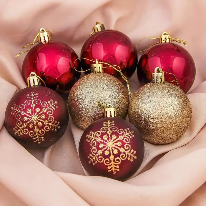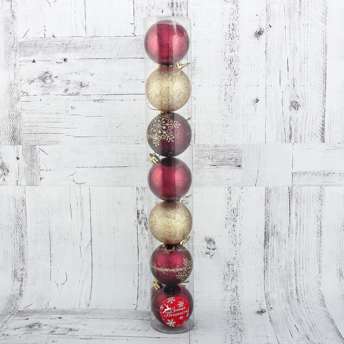 Ёлочные игрушки «Золотая снежинка», шары новогодние, d=6 см, набор 7 шт., золотисто-бордовый — Характеристики
