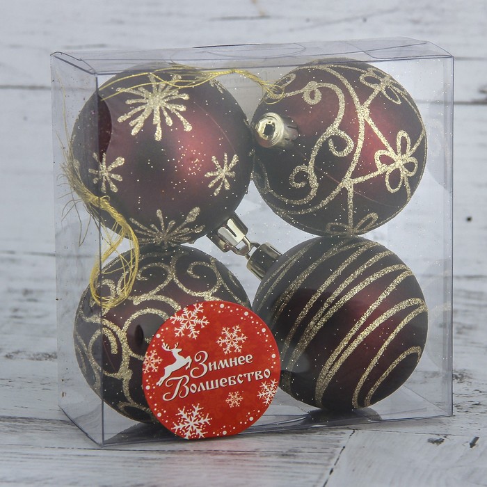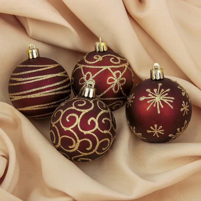 Новогодние шары бордового цвета, 6 см в диаметре, набор из 4 штук — это стильно оформленный акцент для праздничной ёлки. Игрушки с золотыми узорами добавляют декору роскоши и делают образ дерева более нарядным. Такие украшения подходят под разные стили: от «новогоднего барокко» до советской классики.
