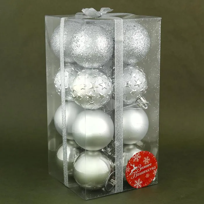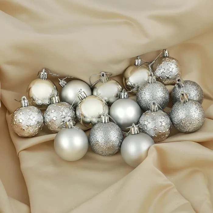 Звёзды зимнего неба на кончиках ветвей. Новогодние шары «Звёздная ночь» — это набор из 16 пластиковых украшений диаметром 5 см, выполненных в серебристом цвете. Игрушки в форме классических шаров подчёркивают атмосферу Нового года и подходят для оформления в датском, скандинавском или ар-деко стиле. Это не просто ёлочные аксессуары — они создают ощущение ночного неба, усыпанного светом зимних звёзд.