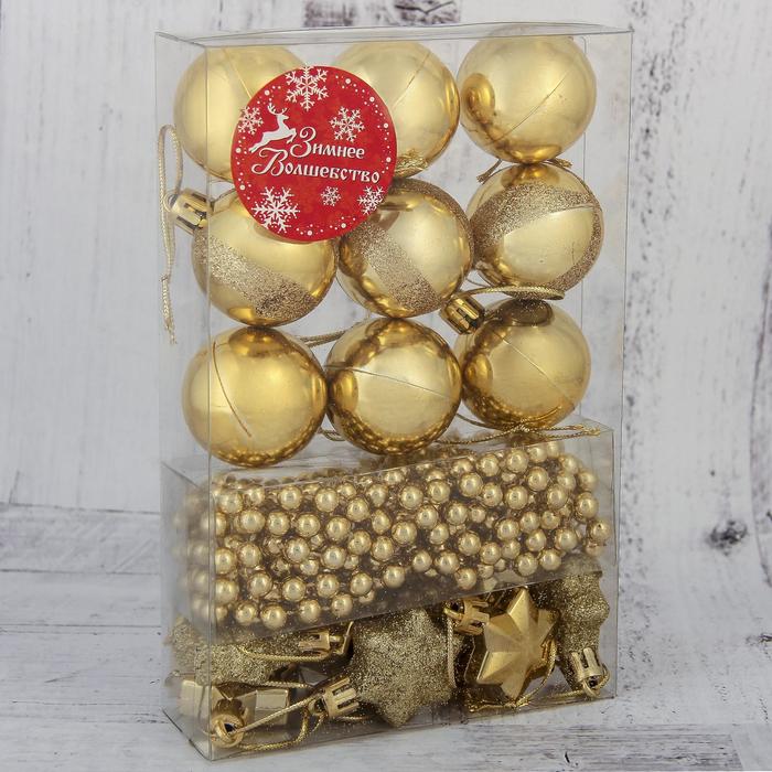 Ёлочные игрушки «Звёздная ночь», пластиковые, набор 18 шт. (9 шаров, 8 звёзд, бусы), золотистый — Характеристики