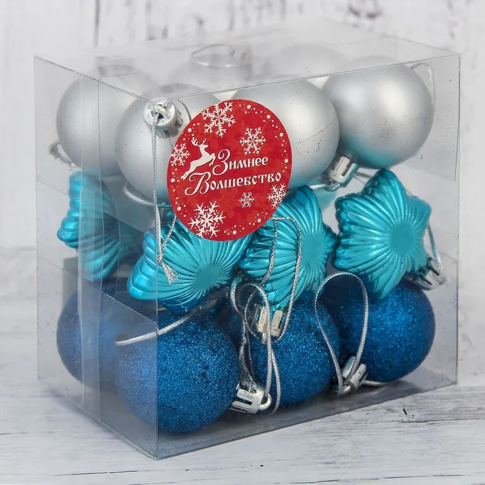 Этот набор превращает ёлку в пространство зимней сказки и спокойного торжества. Синие и серебристые тона добавляют дереву света и порядка, но не перегружают общий дизайн. Используйте игрушки как основу или как часть уже готового декора — они одинаково хорошо работают в разных идеях праздничного убранства.