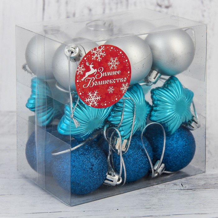 Ёлочные игрушки «Звёздный», набор 18 шт. (12 шаров, d=4 см, 6 звёзд) серебристый/синий — Характеристики