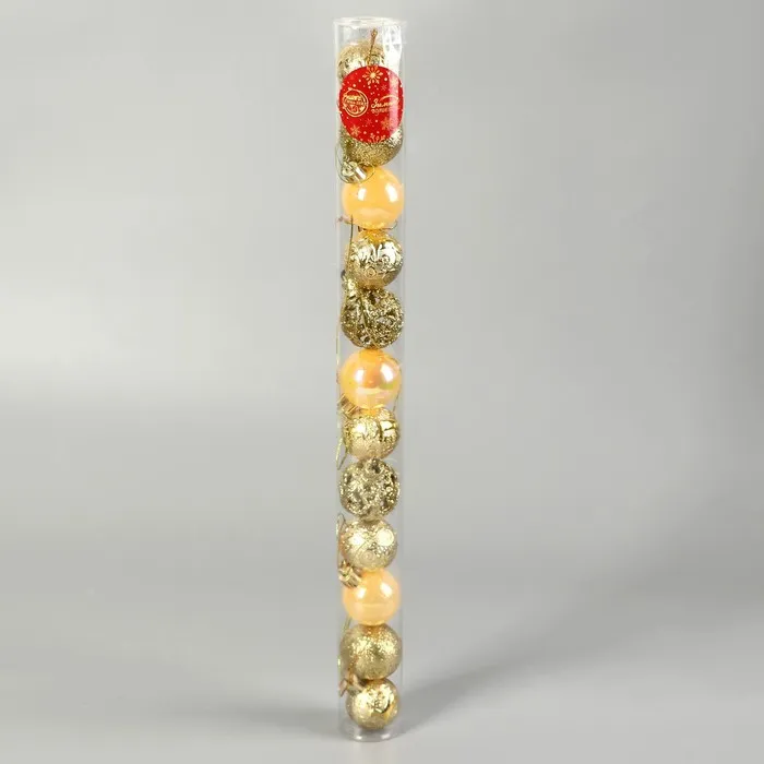 Набор золотых новогодних шаров «Мелодия» добавит блеска праздничной ёлке. Пластиковые элементы с орнаментом блеск и однотонным дизайном в стиле классики создают уютную атмосферу для новогодних торжеств.