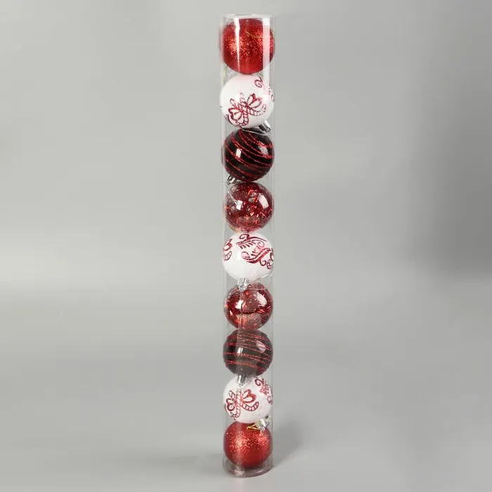 Набор из девяти новогодних шаров с красно-прозрачным миксом оттенков и орбитальным рисунком подчёркивает скандинавскую эстетику праздничного декора. Пластиковые украшения диаметром 6 см создают лёгкую и воздушную атмосферу, добавляя разнообразия и глубины в оформление ёлки.