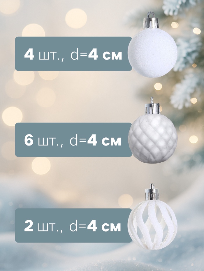 Белые шары отражают снег и свет, напоминая о зимних прогулках и семейных вечерах у камина. Они помогают сосредоточиться на моменте, когда близкие собираются вместе, обсуждая планы и воспоминания. Этот набор становится частью традиции, где каждый шар добавляет нотку чистоты и гармонии, делая новогодний декор более личным и запоминающимся.
