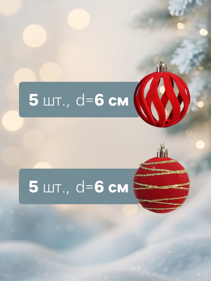 Красные шары в этом наборе напоминают о тепле домашнего очага и традициях зимних праздников. Их насыщенный цвет оживляет интерьер, создавая контраст с зеленью хвои и подчёркивая торжественность момента. В свете гирлянд резной узор отражает свет, добавляя мерцание и динамику в праздничное оформление.