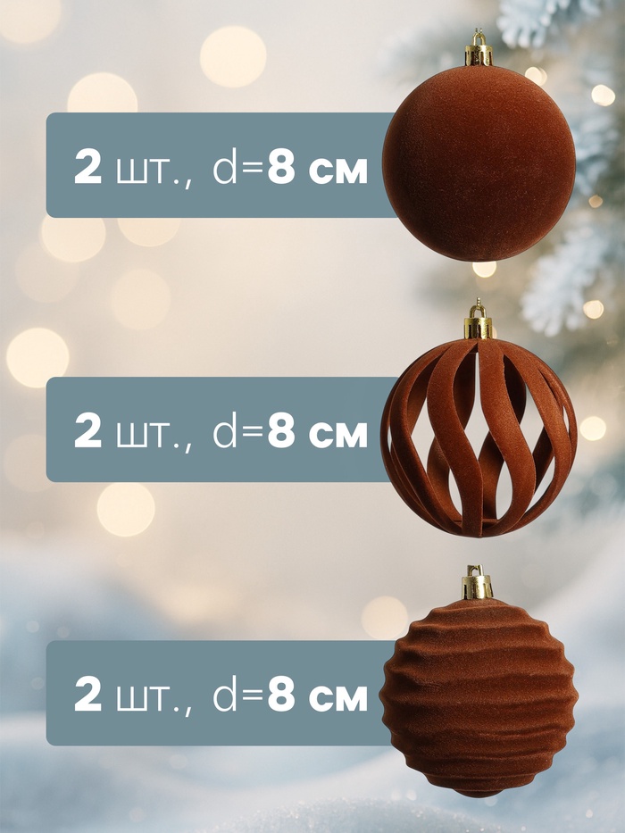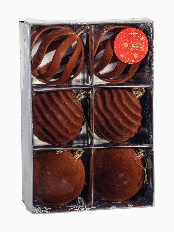 Набор из шести коричневых ёлочных шаров диаметром 8 см добавит в праздничное оформление нотку изысканности и глубины, гармонично вписываясь в интерьер благодаря своему тёплому и естественному оттенку. Эти пластиковые украшения обладают текстурой, которая имитирует бархат, создавая эффект мягкости и объёма при отражении света. Размер и форма делают их подходящими для разнообразных ёлок, от компактных домашних до более просторных, обеспечивая баланс в композиции декора. Такой набор помогает подчеркнуть уют и традиции праздника, превращая обычное украшение в элемент, который вызывает ощущение близости и тепла в семейном кругу.