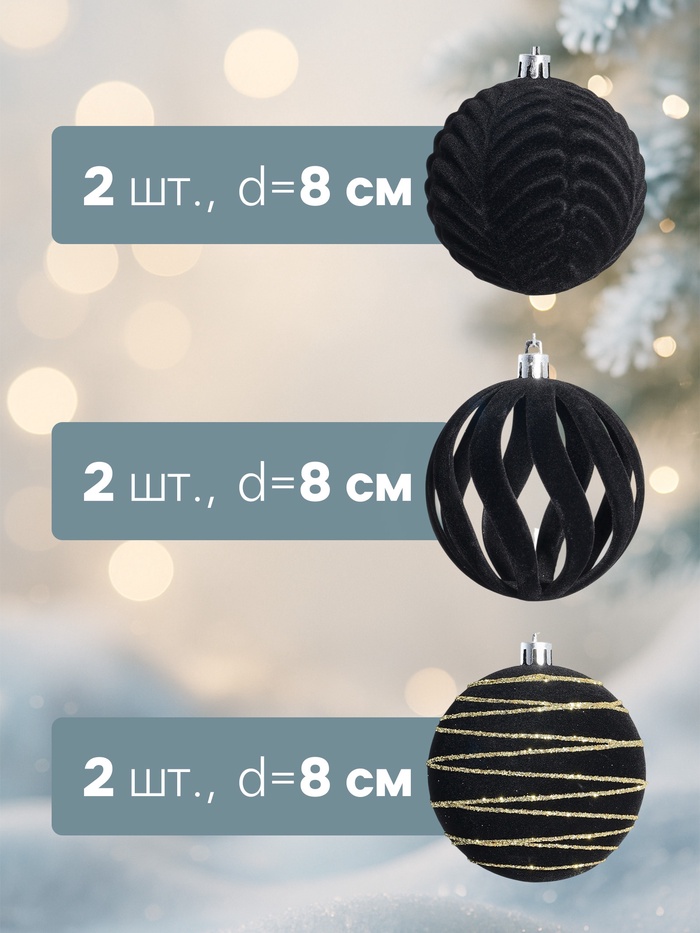 Набор из шести чёрных ёлочных шаров диаметром 8 см представляет собой стильное решение для создания праздничного декора с глубоким и насыщенным оттенком. Эти пластиковые украшения сочетают в себе однотонную поверхность с изящным резным рисунком, что придаёт им особую текстуру и выразительность. Благодаря универсальному размеру и насыщенному чёрному цвету, набор подходит для оформления ёлок в самых разных стилях — от классического до современного минимализма. Такой декор помогает создать атмосферу торжественности и уюта, подчёркивая индивидуальность праздничного пространства.