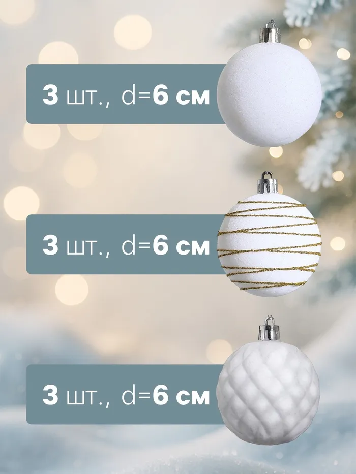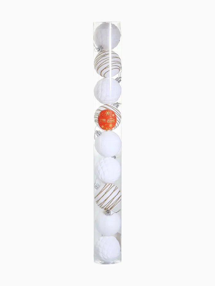 Набор из 9 белых ёлочных шаров диаметром 6 см воплощает чистоту и элегантность зимнего праздника. Пластиковые украшения с резным узором и однотонной поверхностью формируют бархатистый эффект, добавляя интерьеру глубину и мягкость. Этот комплект подходит для различных стилей оформления, гармонично сочетаясь с другими элементами декора и подчёркивая природную красоту новогодней ёлки в домашних условиях.