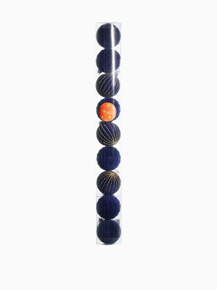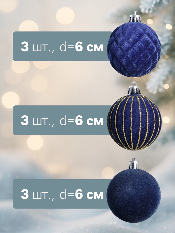 Набор из 9 синих ёлочных шаров диаметром 6 см привносит глубину и спокойствие в новогодний декор. Пластиковые украшения с резным узором и однотонной поверхностью создают бархатистый эффект, гармонично вписываясь в интерьер и подчёркивая естественную красоту праздничной ёлки. Этот комплект подходит для создания сдержанного и стильного оформления, где каждый элемент способствует ощущению уюта и гармонии в домашних условиях.