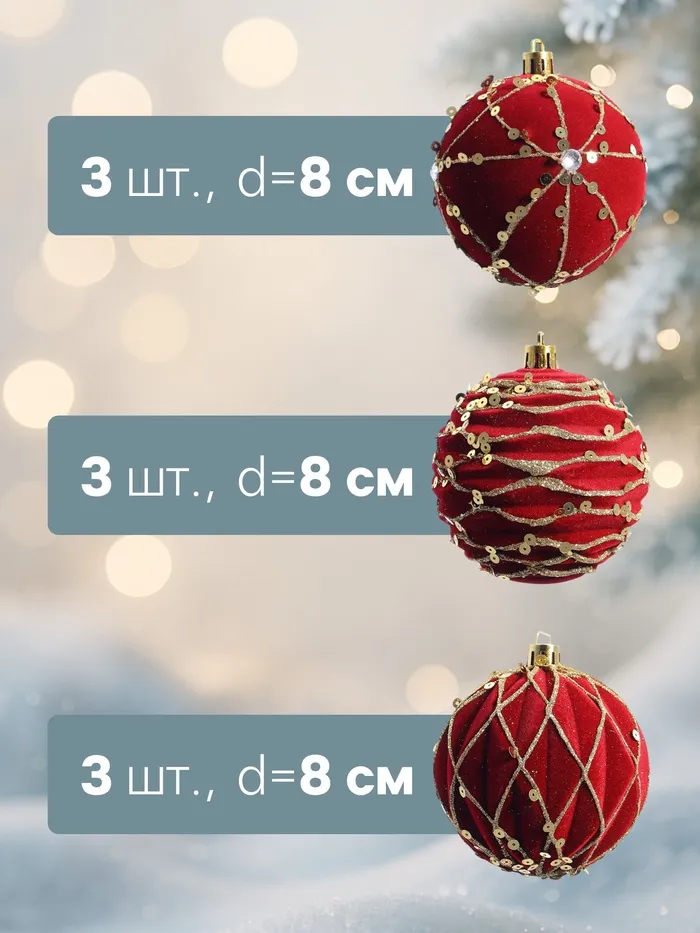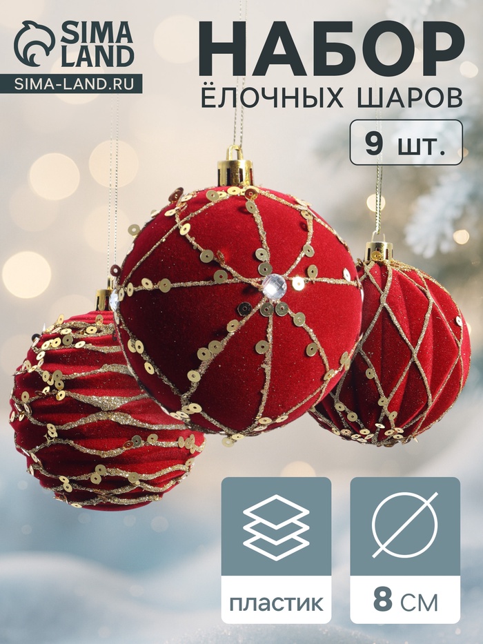 • Комплект состоит из 9 шаров, что позволяет создать гармоничную композицию на ёлке.