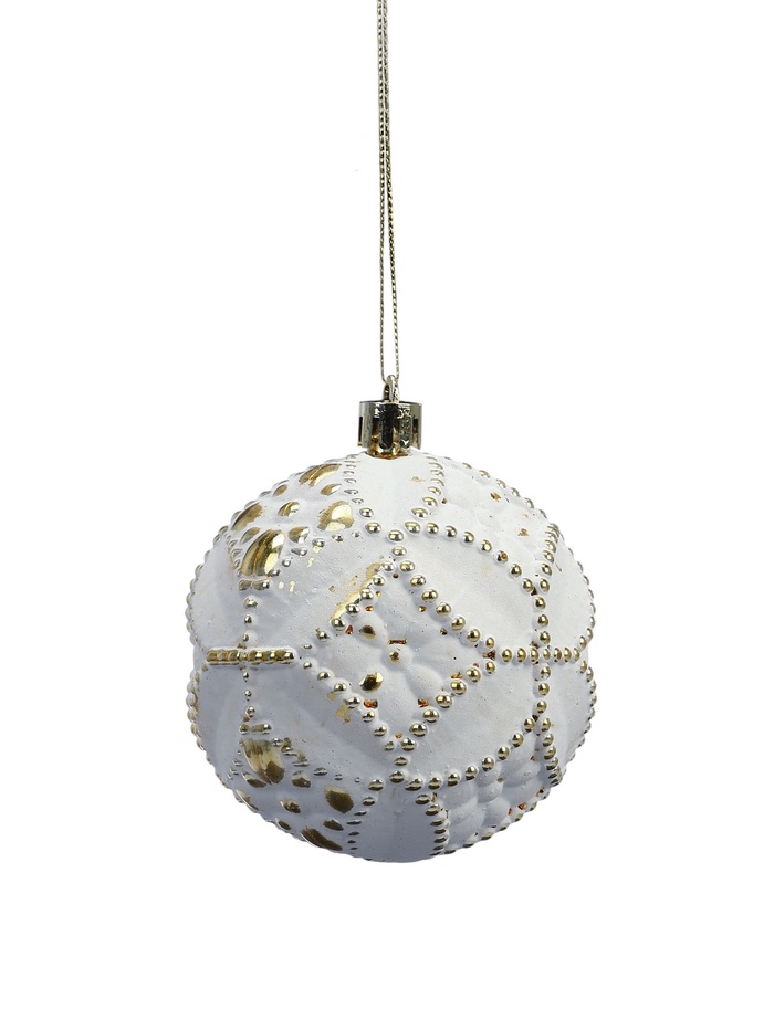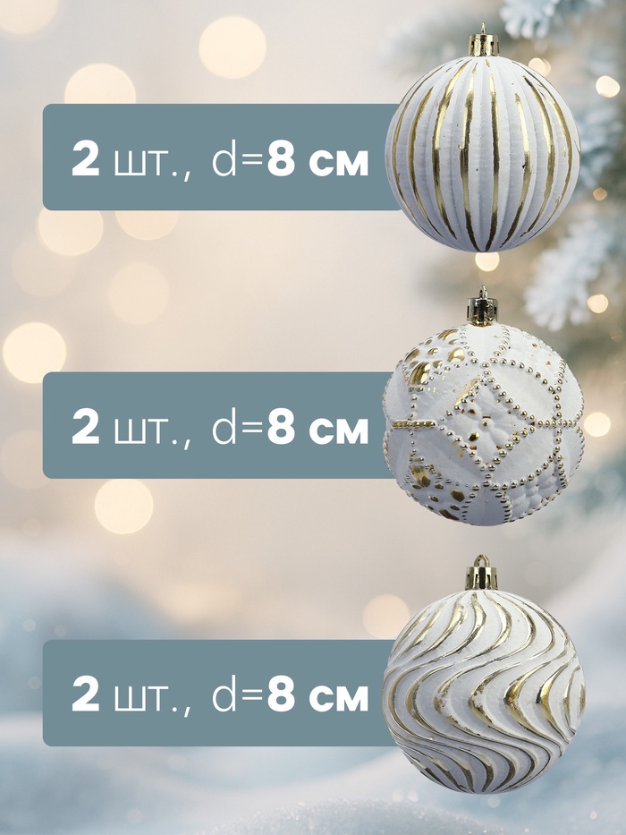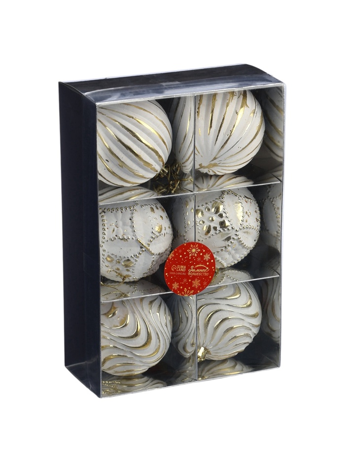 Набор из шести новогодних шаров в винтажном стиле станет изящным дополнением праздничного декора. Бело-золотистые оттенки создают атмосферу тепла и уюта, подчёркивая традиционную элегантность зимних праздников. Шары диаметром 8 см подходят для украшения как больших, так и компактных ёлок, позволяя легко комбинировать с другими элементами оформления.