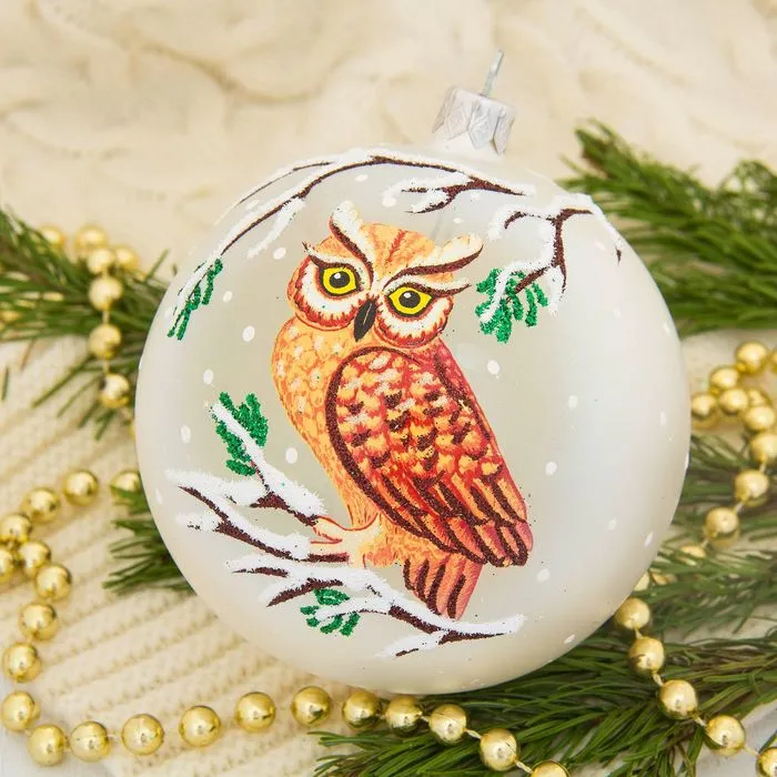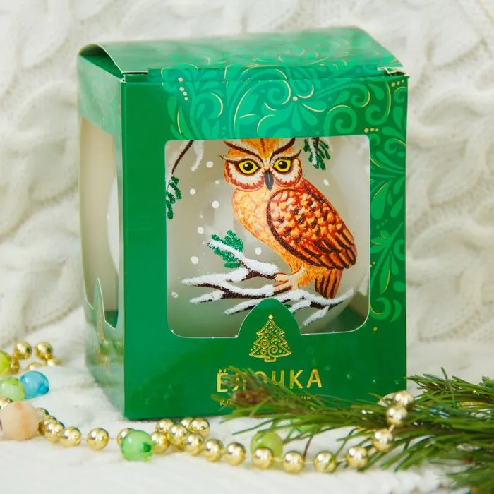 Новогодний шар Филин — украшение, которое привносит в декор праздничную атмосферу. Прозрачный цвет с рисунком филина создаёт ощущение лёгкости и зимней сказки. Этот стеклянный шар подходит для тех, кто ценит сочетание традиций и современных тенденций в оформлении ёлки.