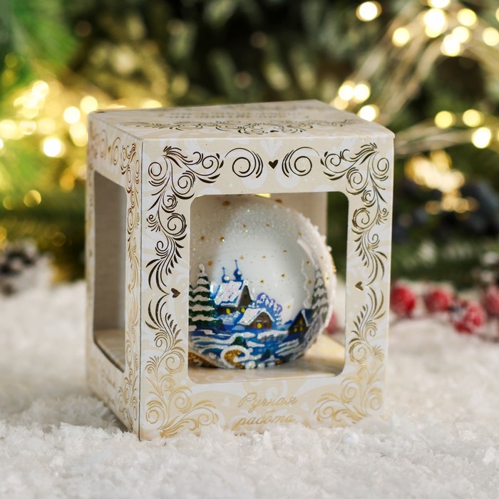 Новогодний шар с изображением деревенского пейзажа станет изящным акцентом в праздничном оформлении интерьера. Белоснежная основа подчёркивает чистоту и спокойствие зимнего настроения, а рисунок создаёт атмосферу уюта и ностальгии, объединяя в себе черты датского минимализма, классики, советского ретро и шебби-шика.