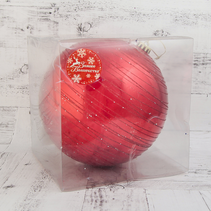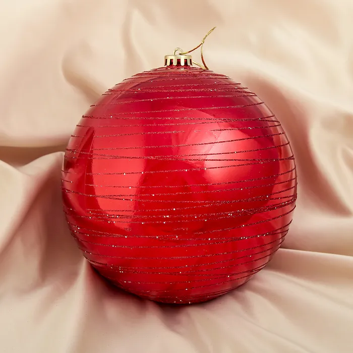 Крупный красный шар диаметром 20 см создаёт выразительный акцент в новогоднем декоре. Его размер притягивает внимание, становясь центральным элементом праздничного оформления. Пластиковая конструкция сочетает лёгкость с прочностью, сохраняя форму и цвет на протяжении многих сезонов.