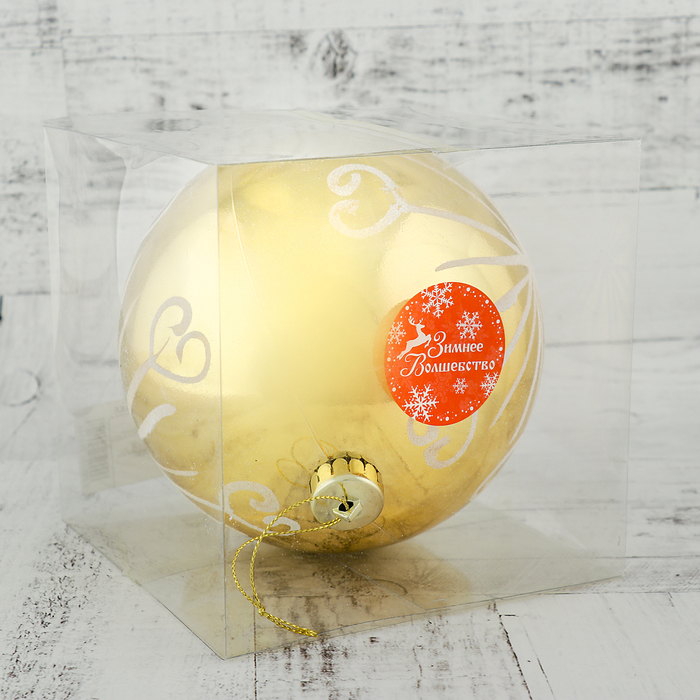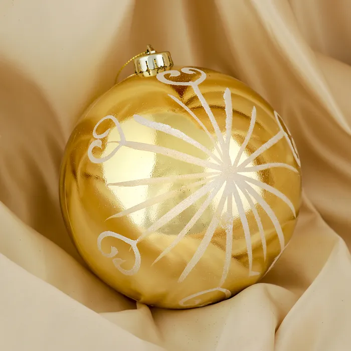 Пластиковый новогодний шар золотистого цвета с рисунком — это крупный праздничный акцент для тех, кто хочет добавить ёлке тепла и света. Игрушка диаметром 15 см выполнена в классической форме и украшена узором, который подчёркивает её торжественность. Украшение подходит под стили ар-деко, барокко и строгой классики — идеально для создания центрального элемента на дереве.