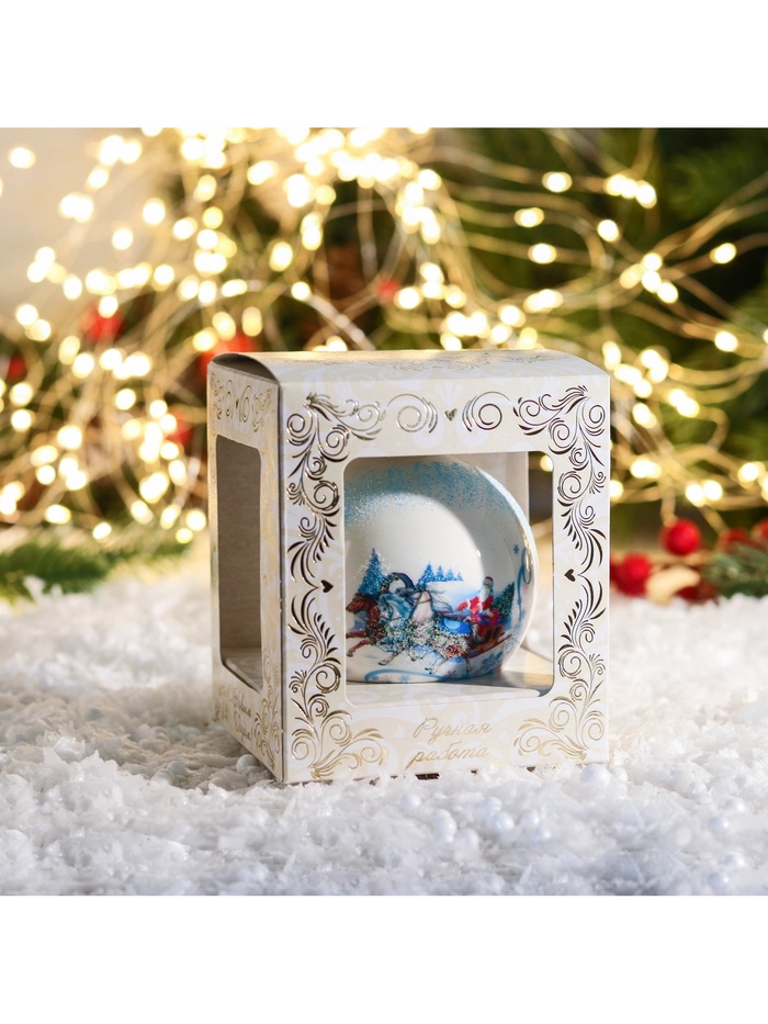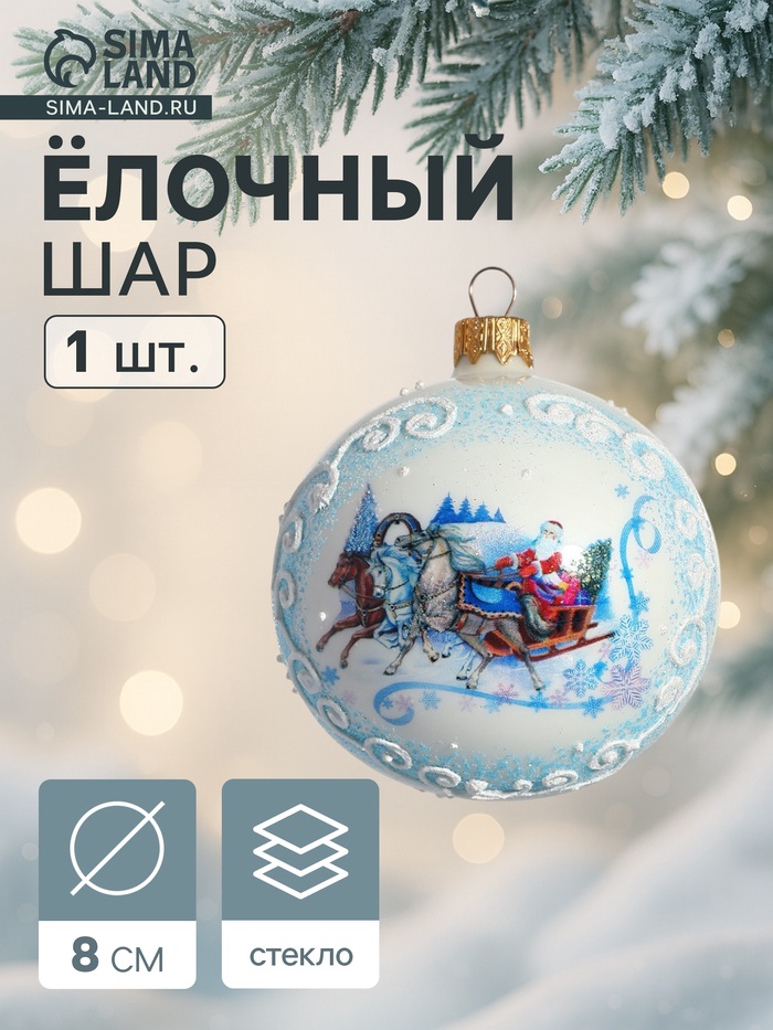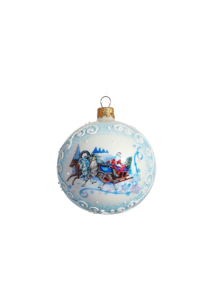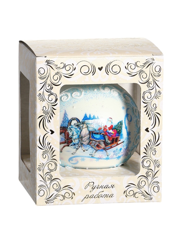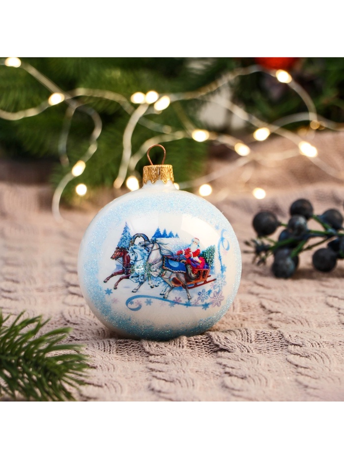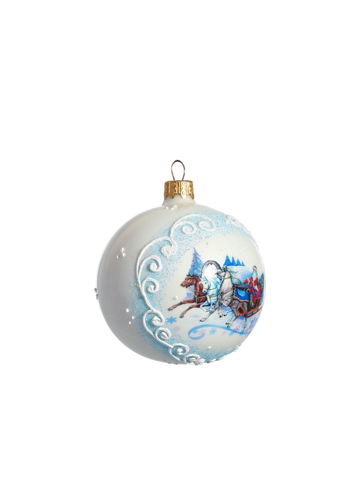 Стеклянный шар с изображением тройки лошадей — белый новогодний аксессуар, который символизирует движение и традиции праздника. Он впишется в композиции в советском, датском, классическом, скандинавском или шебби-шик стилях, добавляя нотку ностальгии.