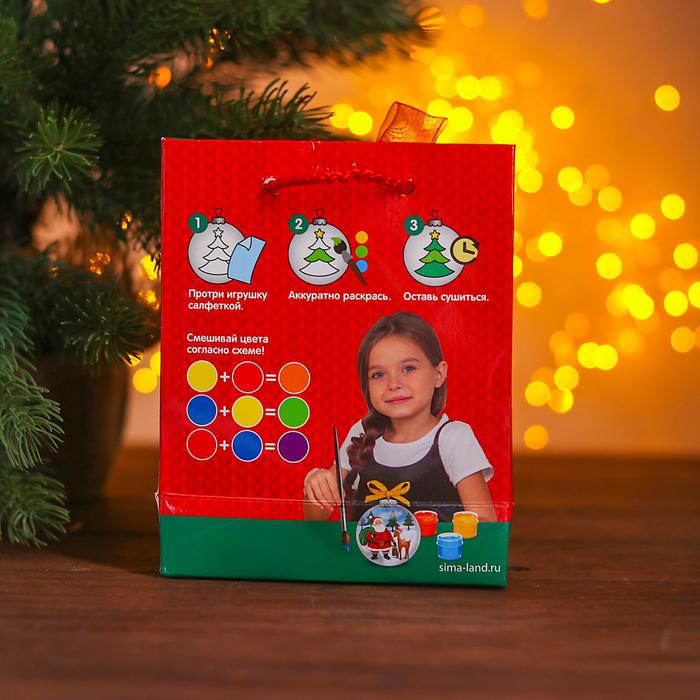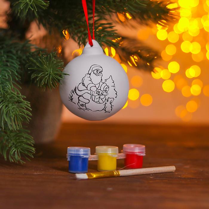 Ёлочный шар под роспись «Дед Мороз с подарками», подарочный набор, с подвесом, краска 3 цвета по 2 мл, кисть — Характеристики