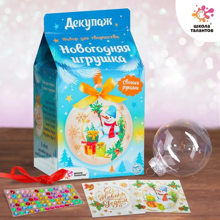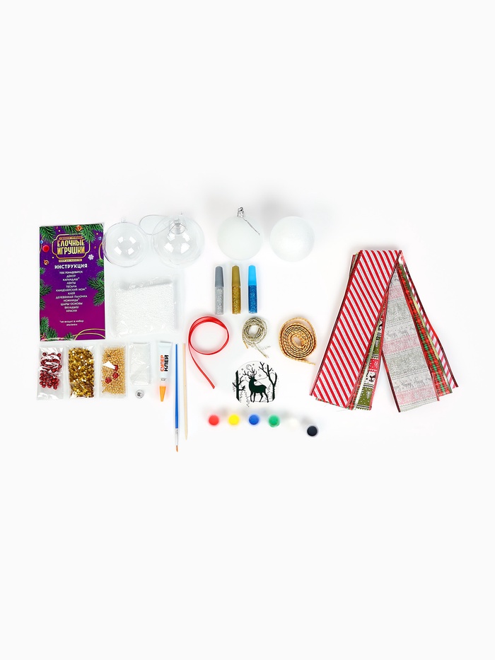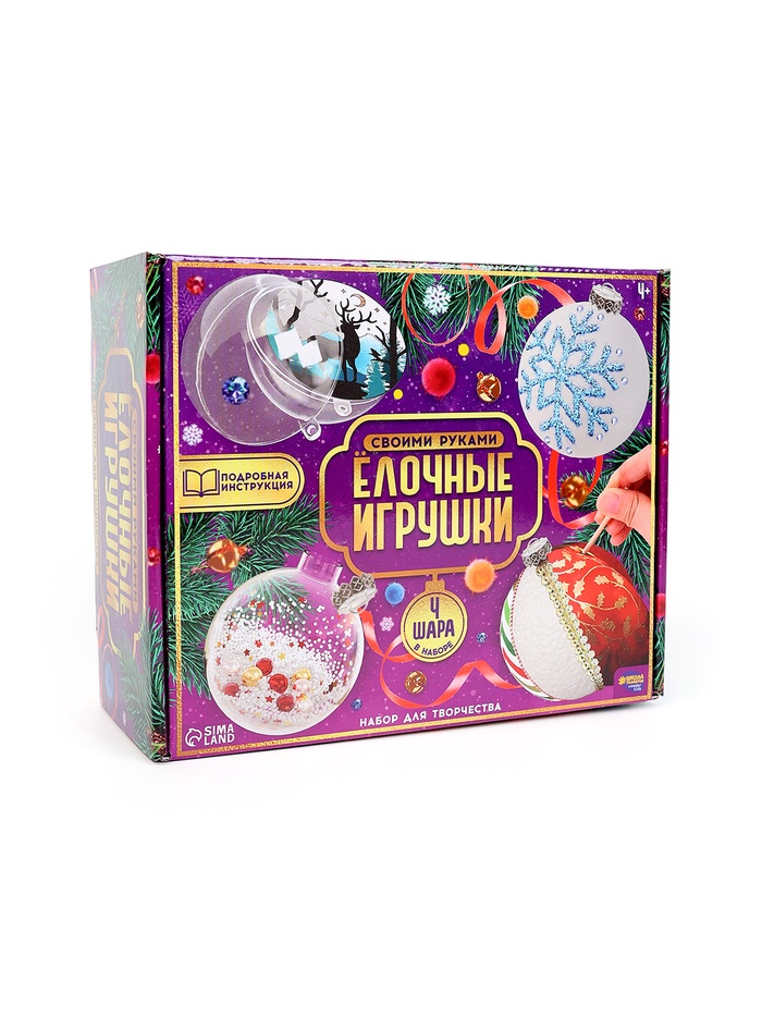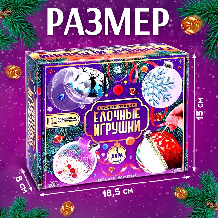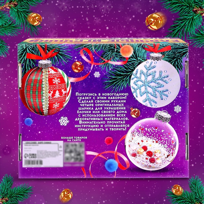 Создайте ёлочные шары с собственным дизайном! В наборе вы найдёте всё необходимое, чтобы сделать четыре разных украшения своими руками. Разнообразие материалов позволит воплотить в жизнь любые идеи. Вам остаётся только проявить фантазию и насладиться творческим процессом. Готовые игрушки будут радовать вас не один год, напоминая о тёплых моментах и радостных предновогодних днях.
