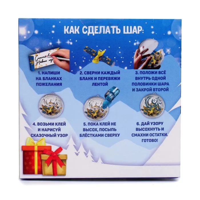 Напишите ваши заветные мечты/пожелания на бланках из набора, заверните каждое в трубочку и перевяжите ленточкой. Поместите полученные свитки внутрь половинки шара и закройте второй половиной.