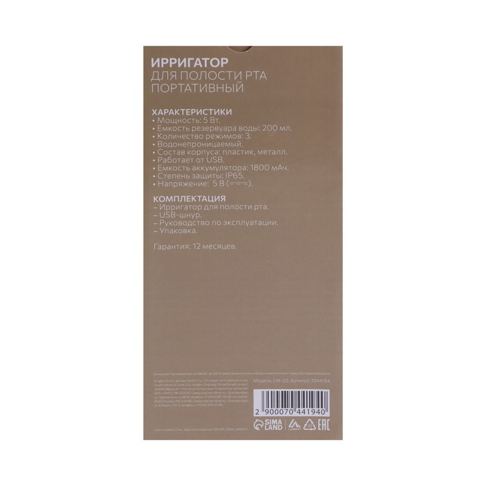 Ирригатор для полости рта Luazon LIR-02, портативный, 200 мл, 3 режима, 1 насадка, от USB — Характеристики