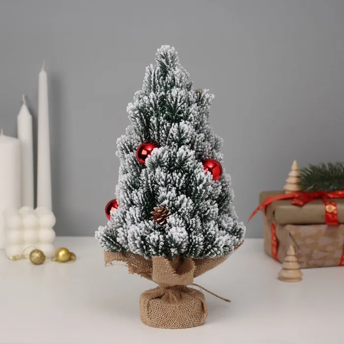 Настольная литая ёлка высотой 31 см украшена красными шарами и шишками, дополнена мешочком для хранения. Отгибающиеся ветки из прочного пластика создают объём и естественный силуэт, а зелёная хвоя подчёркивает праздничный образ. Стиль изделия объединяет новогоднее барокко, советские мотивы и фьюжн, что делает декор универсальным и выразительным.
