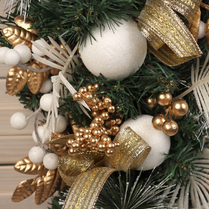 Настенная ёлка «Ажурная», 60 см, с бело-золотым декором — это объёмный и доброжелательный элемент новогоднего убранства. Подвесная модель высотой 60 см выполнена из мягких ПВХ-веток с отгибающимся креплением, имеет зелёную хвою и украшения белого и золотистого цветов — акцент в стиле классики и советской эстетики для тех, кто ценит свет, текстуру и зимнюю атмосферу без лишней пестроты.