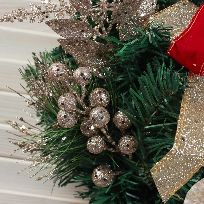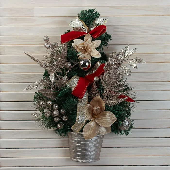 Настенная ёлка «Магнолия золотая», 50 см, с золотым декором — это тёплый и изысканный элемент новогоднего убранства. Подвесная модель высотой 50 см выполнена из мягких ПВХ-веток с отгибающимся креплением, имеет зелёную хвою и украшения золотистого цвета — акцент в стиле классики и советского дизайна для тех, кто ценит свет, объём и атмосферу Нового года в формате настенного или дверного оформления.
