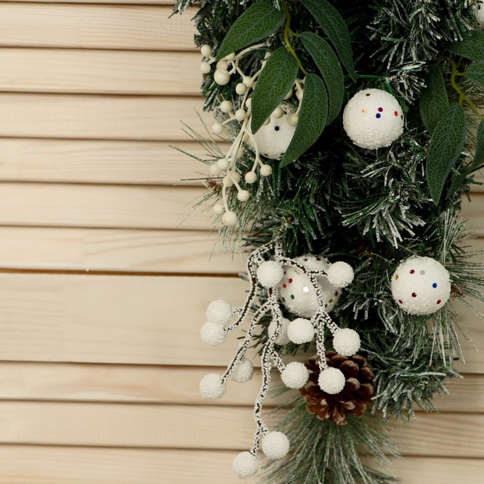 Настенная ёлка «Уютная сказка», 60 см — это мягкий и доброжелательный акцент для новогоднего убранства. Подвесная модель высотой 60 см выполнена из ПВХ-веток с отгибающимся креплением, имеет зелёную хвою и украшения белого цвета — элемент оформления в стиле ар-деко, советской эстетики и скандинавского минимализма. Решение для тех, кто ценит свет, объём и зимнюю атмосферу в формате настенного или дверного декора.