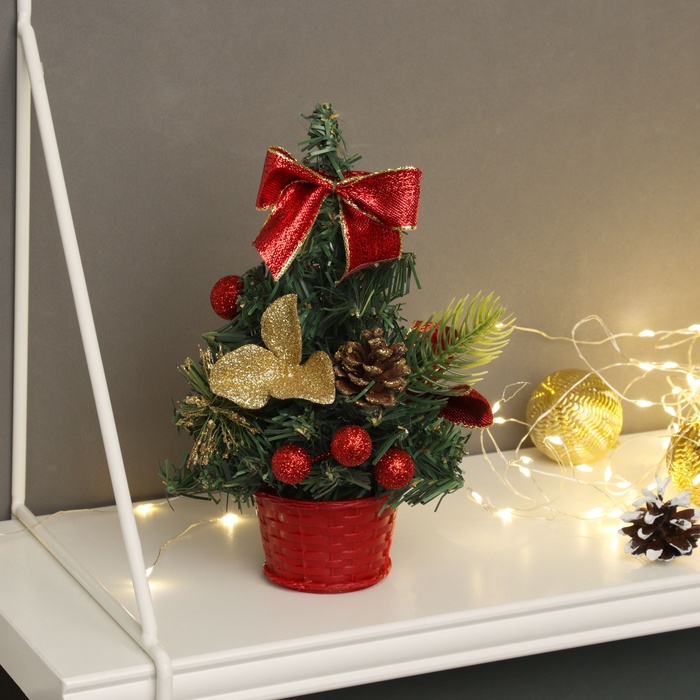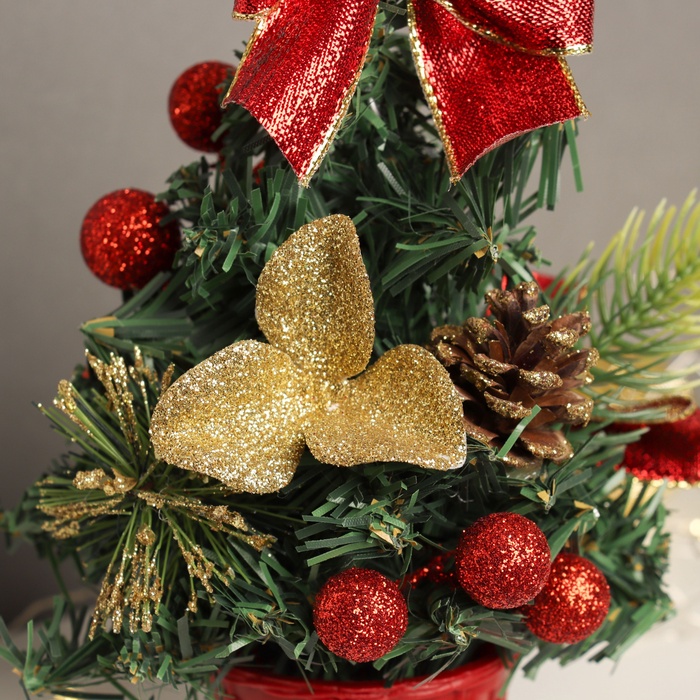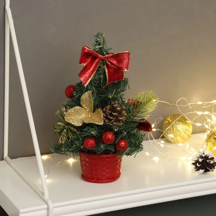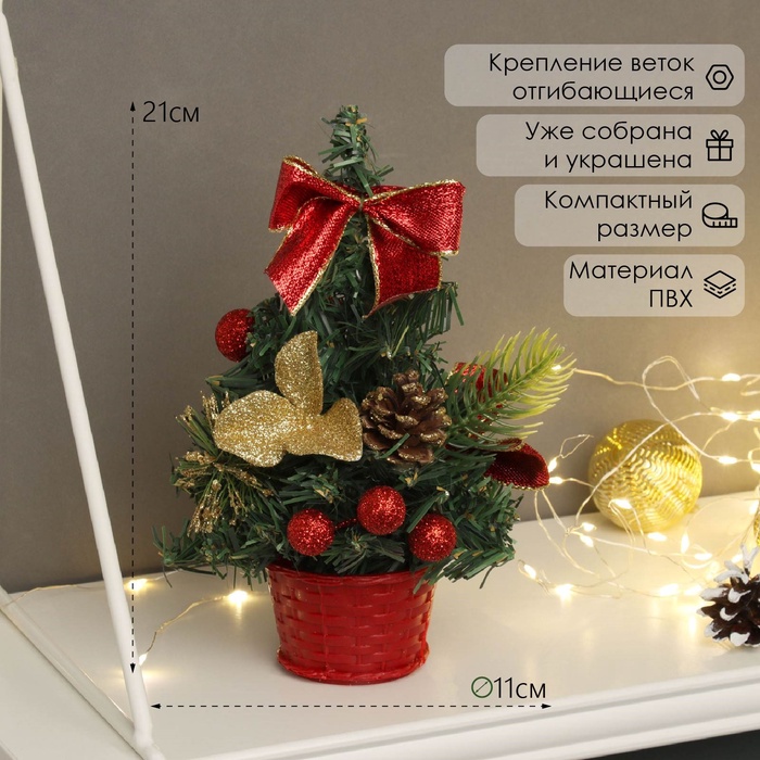Искусственная ёлка настольная «Зимнее волшебство. Бантик» 21 см, ветки ПВХ отгибаются, игрушки красные шары и бант — Характеристики