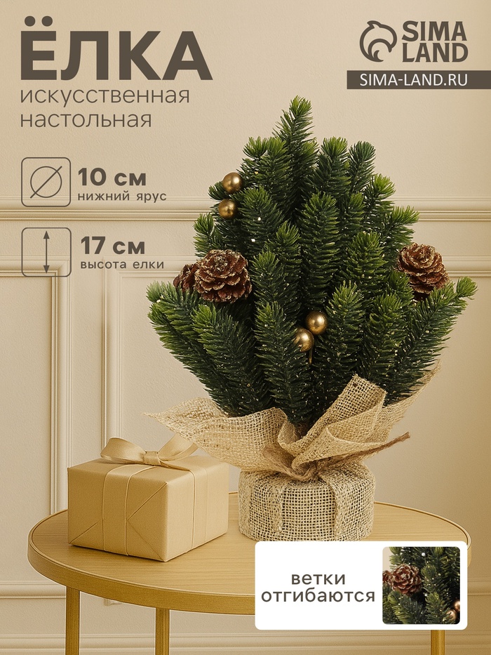 Настольная ёлка «Блеск», 17 см, с золотыми шишками — это лаконичный и доброжелательный акцент для новогоднего убранства. Искусственная модель высотой 17 см выполнена из литых веток с отгибающимся креплением, дополнена декором в виде золотистых шишек — украшение в стиле ар-деко и советской эстетики для дома или офиса. Решение для тех, кто ценит свет, форму и зимнюю атмосферу в мини-формате.