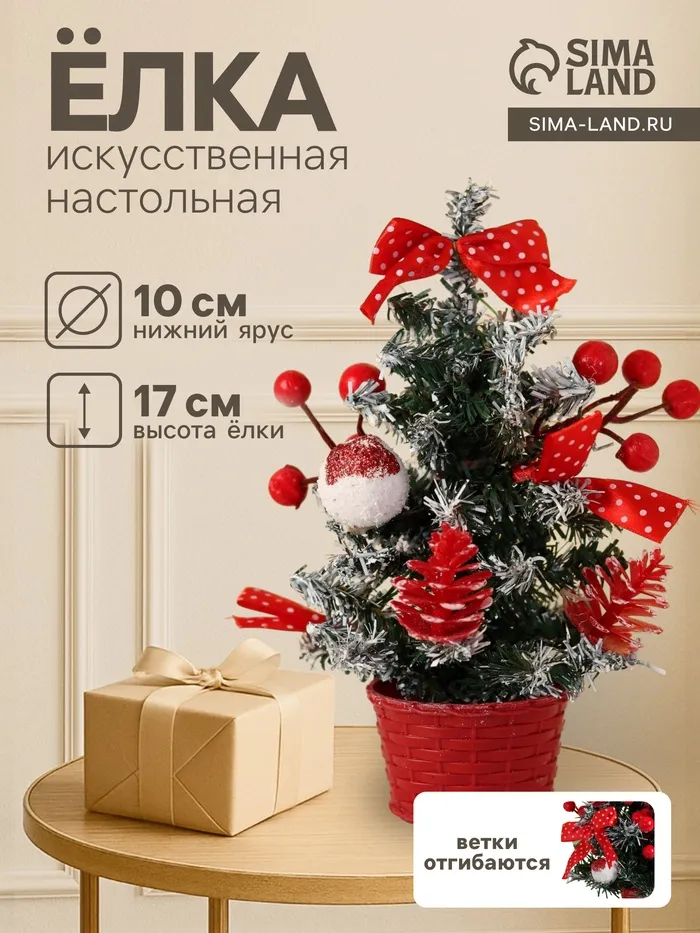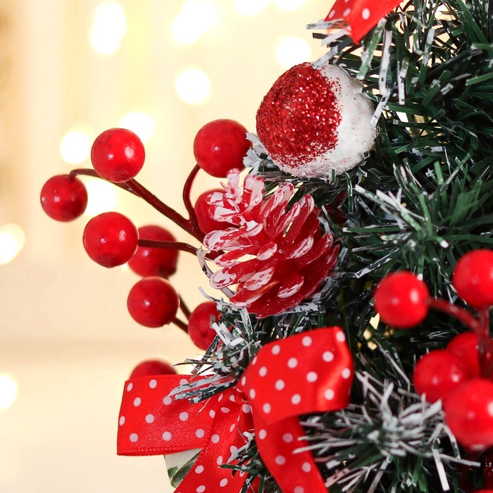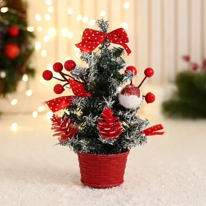 Настольная зелёная ёлка высотой 17 см с отгибающимися ПВХ ветками украшена яркими красными шарами, сочетая в себе элементы классики, ар-деко и скандинавского стилей. Компактный размер и выразительный декор делают её удобным и стильным дополнением праздничного интерьера.