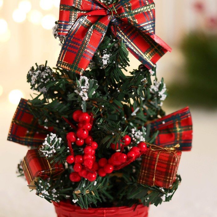Настольная ёлка «Праздничная», 17 см, красный декор — это компактный и доброжелательный акцент для новогоднего убранства. Искусственная модель высотой 17 см выполнена из ПВХ-веток с отгибающимся креплением, имеет зелёную хвою и украшения в виде красных ёлочных игрушек — идеальный элемент декора в стиле классики и фьюжн для дома или офиса. Решение для тех, кто ценит свет, форму и зимнюю атмосферу в мини-формате.