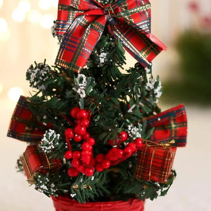 - Тип — настольная ёлка, легко помещается даже на маленьком столе или оконном карнизе.