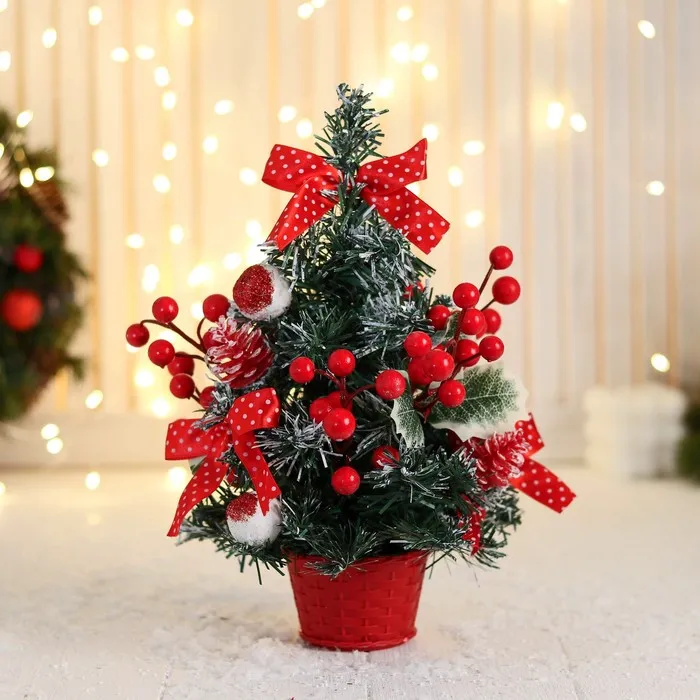 - Тип — настольная ёлка, подходит для оформления малого пространства: стола, полки, оконного карниза.