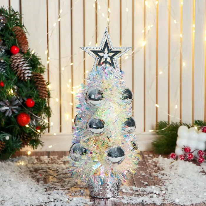 Настольная перламутровая ёлка высотой 26 см станет изящным акцентом в праздничном интерьере. Её компактные размеры и серебристый оттенок хвои создают лёгкую атмосферу зимнего торжества, подходящую для дома или офиса.