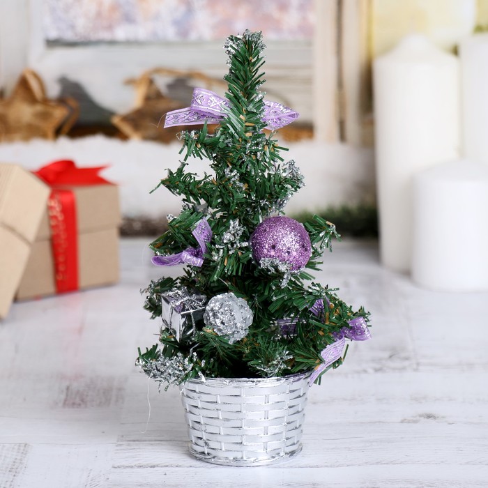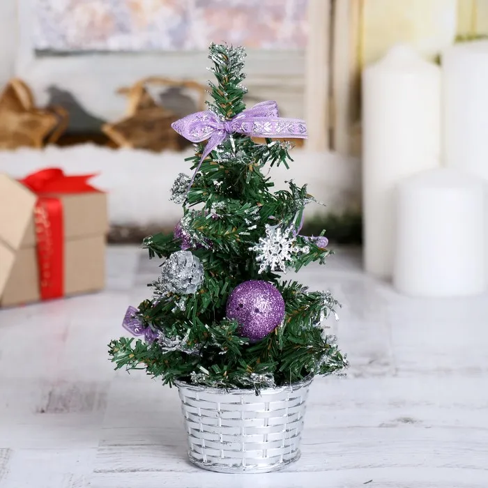 Мини-ёлка высотой 20 см с зелёной хвоей и сиренево-серебристым декором создаёт нежное и стильное украшение для новогоднего интерьера. Отгибающиеся ПВХ ветки помогают придать деревцу естественную форму и объём, что облегчает адаптацию к любому помещению.