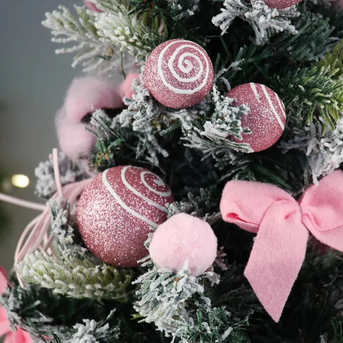 • Розовый декор подчёркивает изящность и придаёт мягкость образу ёлки.