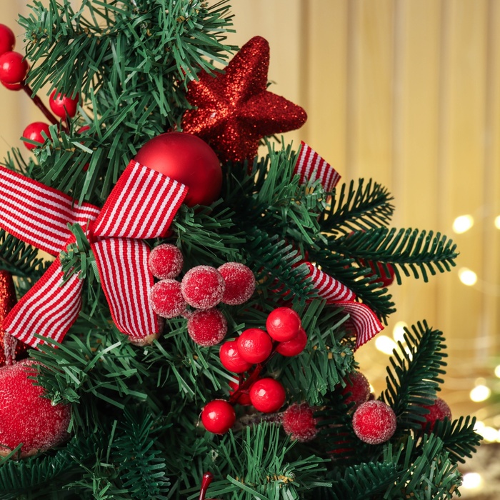 Эта настольная ёлка с красными украшениями и отгибающимися ветками — простой способ наполнить пространство атмосферой зимних праздников. Её можно использовать как самостоятельный акцент или дополнить другими элементами декора. Благодаря прочным ПВХ веткам дерево сохраняет форму и свежий вид в течение всего сезона.