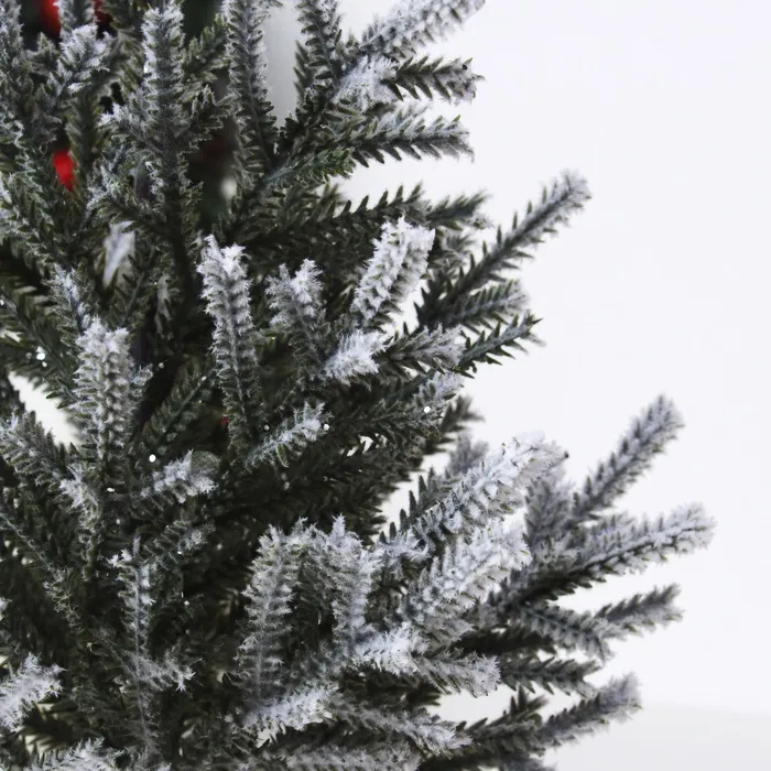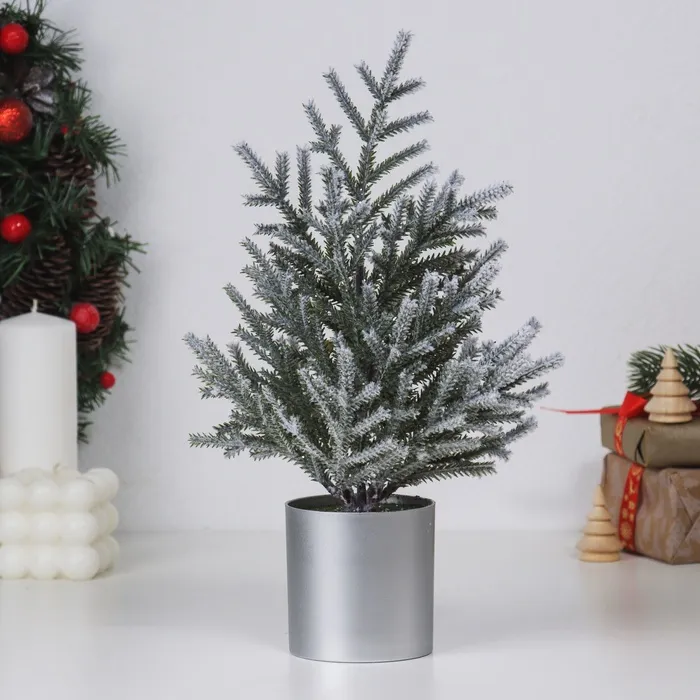 - Тип — настольная ёлка, компактно размещается на столе, подоконнике или полке.