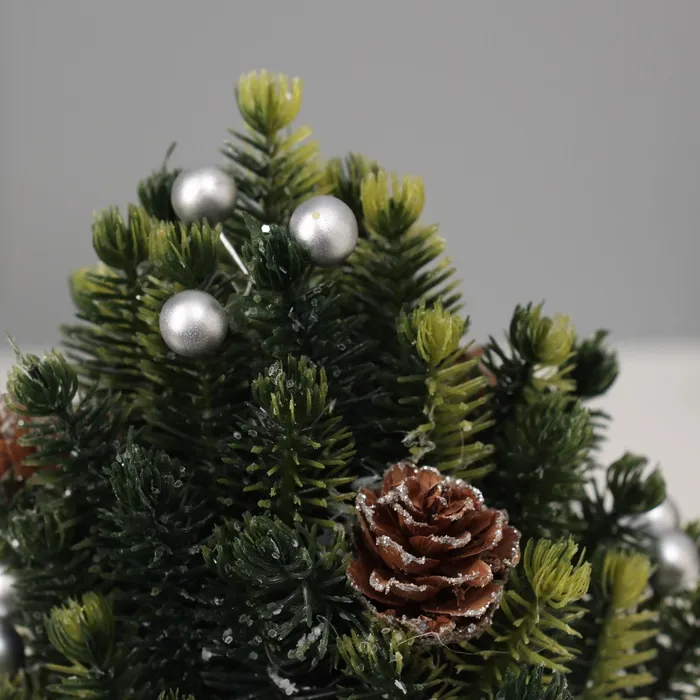 - Тип — настольная ёлка, легко помещается даже на маленьком подоконнике или рабочем столе.