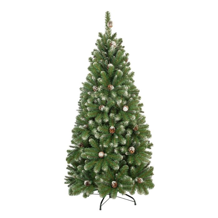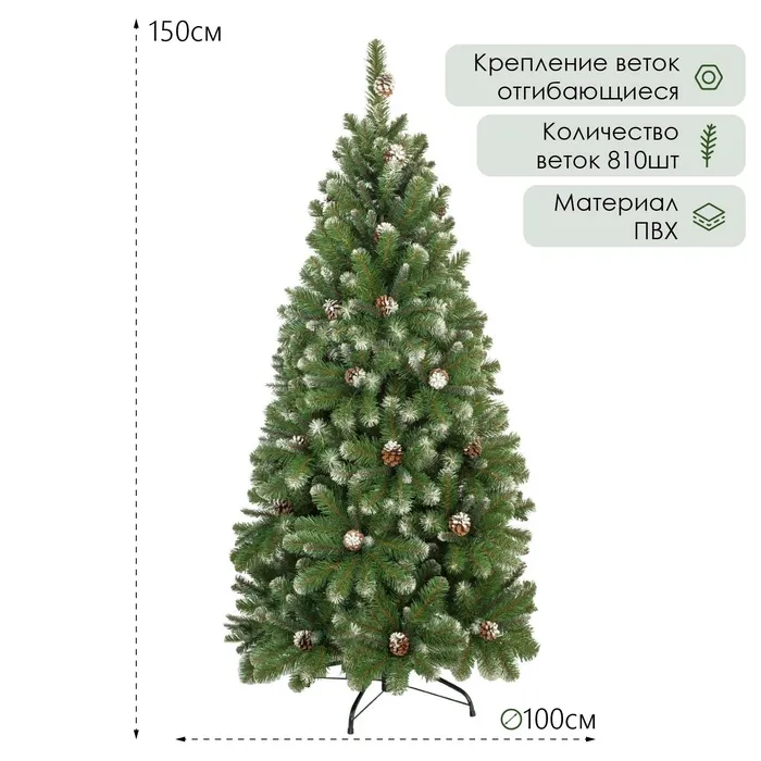 Искусственная ёлка заснеженная «ЕлкиТорг. Снежная королева» с шишками, 150 см, d нижнего яруса 100 см, 810 ПВХ веток на крючках — Характеристики