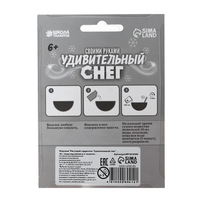 Оформите дом по-новогоднему ярко с помощью искусственного снега. Это праздничное украшение легко можно создать самому: добавьте воды в готовую смесь, подождите 5 минут — и пушистый нетающий снег готов. Из 10 г сухого вещества получится около 300 г снежного декора.