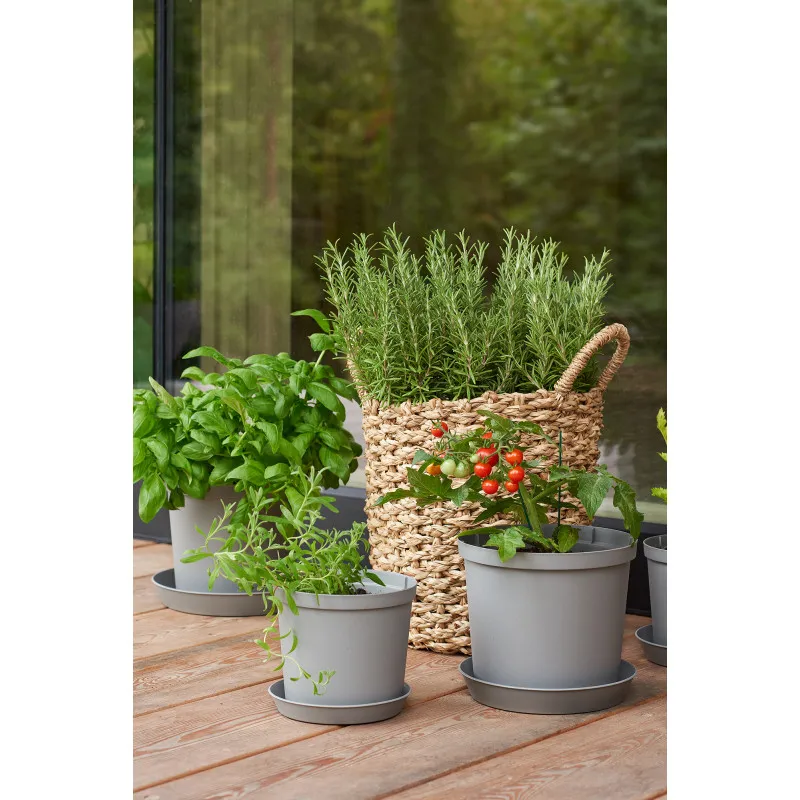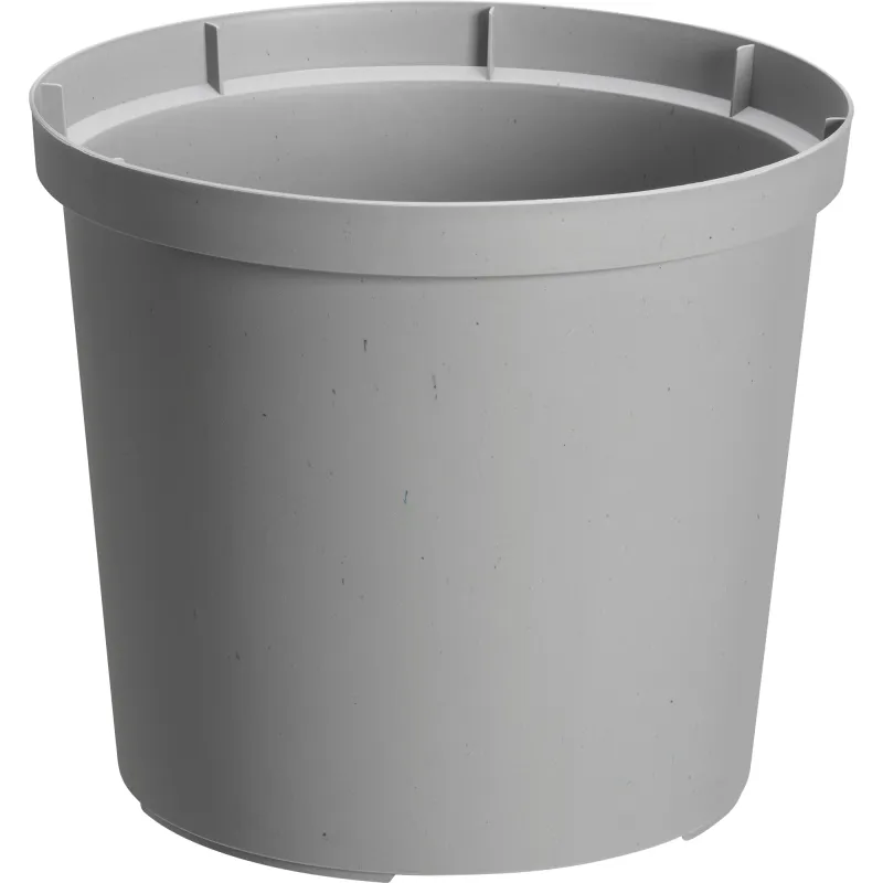 Размер серого горшка: 27 x 27 x 23 см, изготовлен из 100% переработанного пластика.