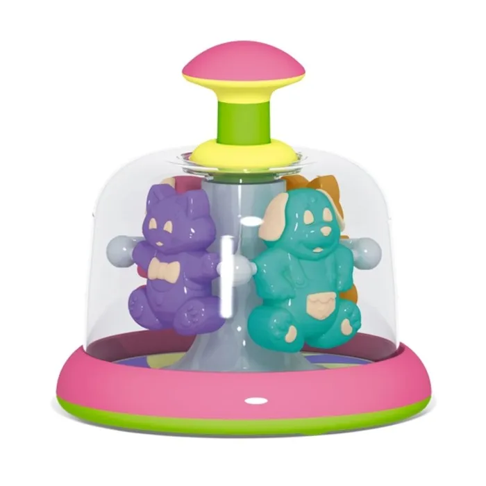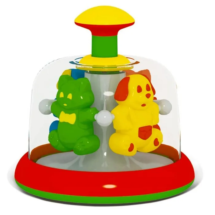 Юла-карусель прочно стоит на поверхности. Красочное цветовое решение игрушки полностью отвечает особенностям младенческого восприятия, визуально привлекая и удерживая внимание ребёнка.