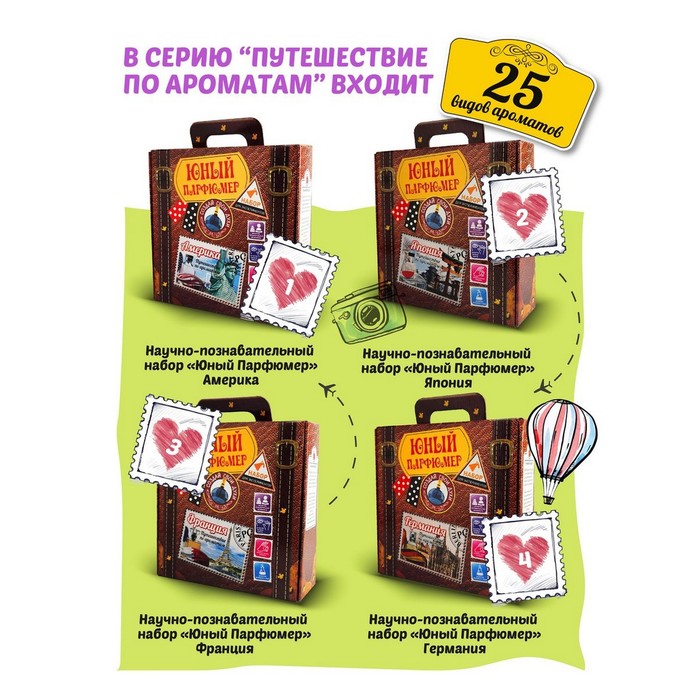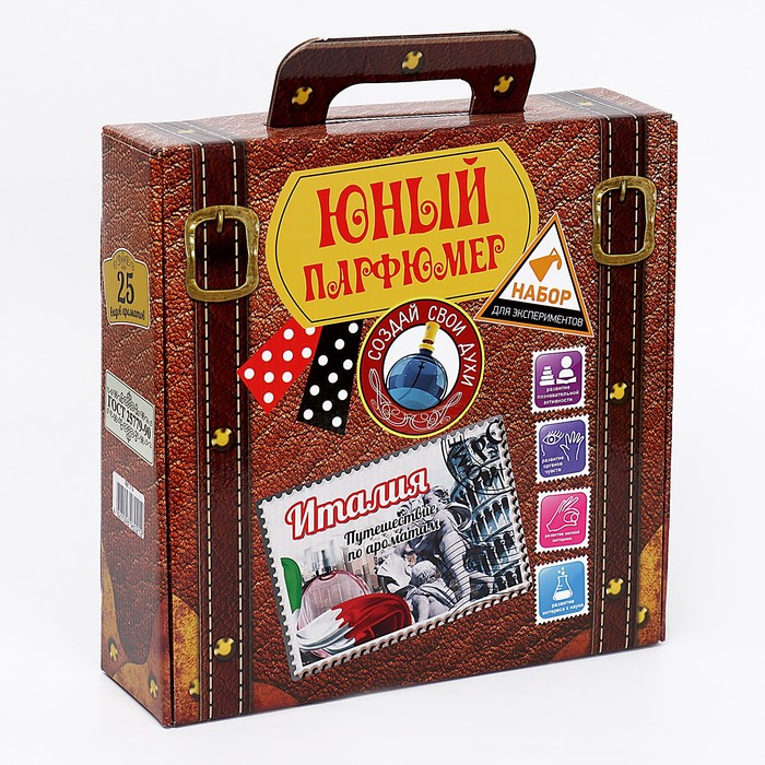 Набор для создания парфюмов «Путешествие по ароматам» на тему «Италия» удивит каждого начинающего парфюмера. Выполненный в виде чемоданчика для путешествий, он позволяет изготовить до 25 различных ароматов, предоставляя всю необходимую парфюмерную основу и оборудование. В комплект включены натуральные эфирные масла, воски, флаконы и другие компоненты, необходимые для создания уникальных запахов.