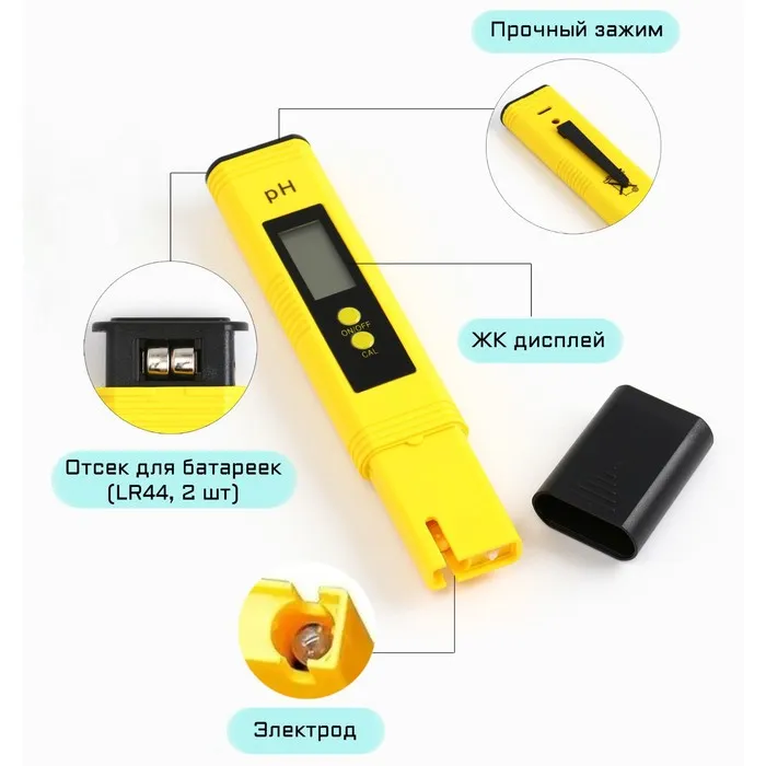 Измеритель кислотности воды, электронный, с порошками для калибровки, 0.00-14.00 pH, 2 LR=44 — Характеристики