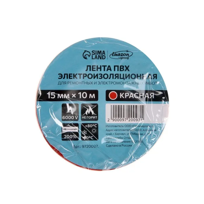 Изолента Luazon Lighting, ПВХ, 15 мм × 10 м, 130 мкм, красная — Характеристики