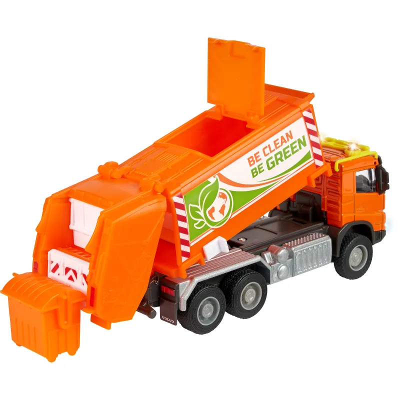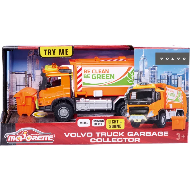 Мусоровоз Volvo от Majorette предлагает увлекательные и простые в использовании функции, а также потрясающие детали. Машина оснащена световыми и звуковыми эффектами, а в комплект входит оранжевый мусорный бак, который крепится к задней части автомобиля. Мусоровоз имеет ручную функцию наклона, свободно вращающиеся резиновые колеса, металлический корпус (die-cast), а также металлические кабину, топливный бак и крылья. Остальные части выполнены из пластика.