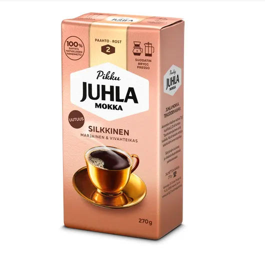 Pikku Juhla Mokka Silkkinen (шёлковый) - кофе тонкого помола. Смесь светлых кофейных зёрен с нотками арабики. Богатый и приятно ароматный кофе происходит от лучших сортов кофе в Африке и Южной Америке. Pikku Juhla Mokka Silkkinen дополняет ассортимент кофе Juhla Mokka от Paulig своим характерным легким и роскошным вкусом. Уровень обжарки 2.